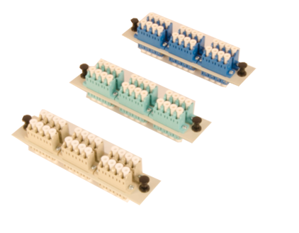 The adapter plates are available in configurations of 6, 8, 12, and 24 ports and come in various color-coded options for multimode and singlemode simplex and duplex FC, LC, SC, and ST adapters.